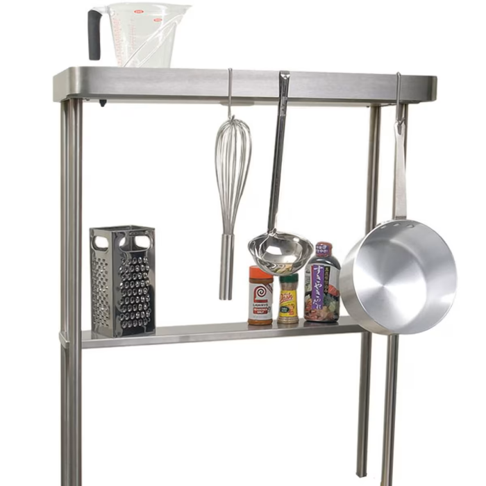 Part of the Alfresco modular line, this stainless steel high shelf with pot rack and light has all the benefits of a true commercial prep station. Attaches directly to the Alfresco 30-inch apron sink (model AGBC-30). Shown here with accessories, NOT INCLUDED.