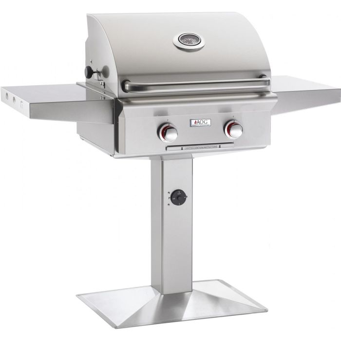 The American Outdoor Grill post model collection is designed for long-lasting, unsurpassed performance that produces unbelievable flavor. All AOG pedestal grills may be bolted to a deck or concrete slab, and are optimized for parks, condominiums, apartments, and anywhere else where space is a premium. Furthermore, AOG pedestal grills feature a built-in safety timer that automatically shuts the gas off after three hours. Alongside the rest of the AOG line, they boast a stylish, sleek appearance, including the beautiful double-layered satin finish hood, stainless steel construction, and custom-designed analog thermometer with polished bezel. Proudly made in the USA and built to last, this AOG T-Series natural gas grill features commercial grade 304 series stainless steel construction, long-lasting stainless cooking grids and heavy-duty warming rack, and highly-sophisticated stainless steel 32,000 BTU U-shaped burners with integrated support posts for performance and durability. If you enjoy grilling veggies, steaks, and chicken all year long on an incredible grill, the first thing you will appreciate is the brand-new Piezo Rapid Light ignition, firing you up that much quicker with no electricity or batteries. Other great features on this grill include 432 sq inches of primary grilling space, stainless steel vaporizer panels (also called flame tamers) for even heat distribution, solid brass valves with red-flared front knobs for precise temperature control and longer life, and a funneled grease management system with slide-out drip tray for painless clean up. Whether you enjoy entertaining the neighbors or rounding up the family for a fresh meal, this AOG 24-inch T-Series gas grill will add style and cooking excellence to compliment your outdoor lifestyle.