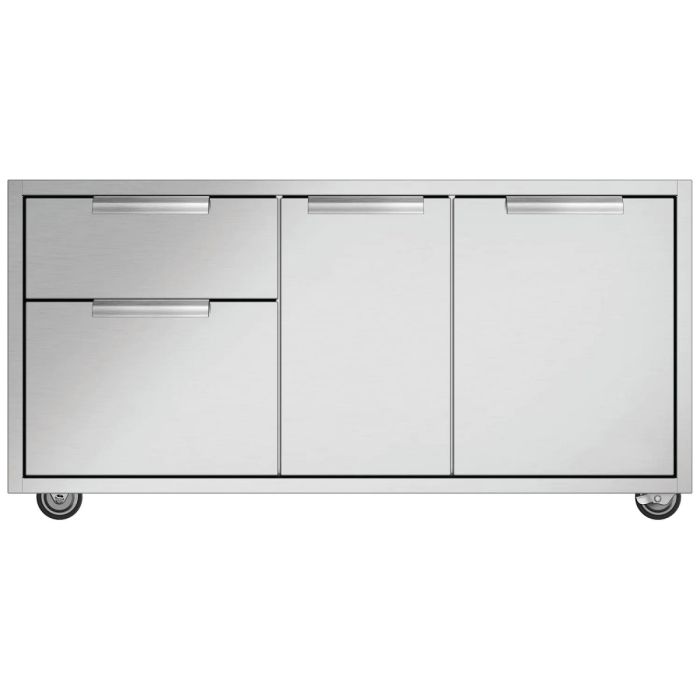 The DCS CAD grill cart is constructed of 18 gauge, 304 grade stainless steel and features a pull-out propane tank storage bin, one small drawer for holding grilling tools, and one large drawer for holding larger items such as wood chips or grill cover. The larger drawer can also be filled with ice to keep drinks or meats chilled. For use with 48-Inch Series 7 and Series 9 grill heads.