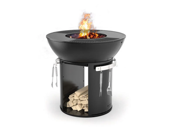 The Zenith features a 38” fire bowl, a cast iron base, a stainless steel cover, and an interior fire grate, featuring LoSmoke technology.