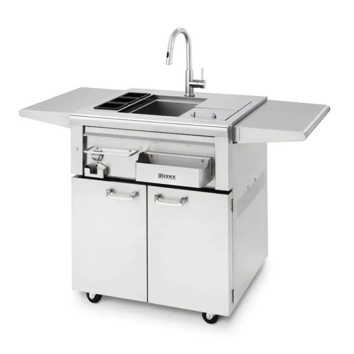 Extraordinary quality and design innovation can be yours with Lynx premium outdoor kitchen accessories. The Lynx Freestanding Cocktail Station features a stainless steel sink with stainless steel pull-down faucet that can be connected to hot and cold water or simply cold only, bottle boots for chilling juices, wines and mixes, speed-rail front bottle storage for quick and easy access to bottles, insulated ice bin with sliding stainless steel cover holds ice for extended periods of time, drain board and slide-away cutting board, built-in bottle opener with integral cap catcher and convenient integrated towel holder, two fold-down shelves that are removable and reversible so they can be used as serving trays, The Lynx Freestanding Cocktail Station also features weather resistant stainless steel construction, front panel illumination with blue LEDs and Lynx signature polished highlights. Doors include bottle shelves that are removable for easy cleaning and four commercial casters make these units easy to move.Extraordinary quality and design innovation can be yours with Lynx premium outdoor kitchen accessories. The Lynx Freestanding Cocktail Station features a stainless steel sink with stainless steel pull-down faucet that can be connected to hot and cold water or simply cold only, bottle boots for chilling juices, wines and mixes, speed-rail front bottle storage for quick and easy access to bottles, insulated ice bin with sliding stainless steel cover holds ice for extended periods of time, drain board and slide-away cutting board, built-in bottle opener with integral cap catcher and convenient integrated towel holder, two fold-down shelves that are removable and reversible so they can be used as serving trays, The Lynx Freestanding Cocktail Station also features weather resistant stainless steel construction, front panel illumination with blue LEDs and Lynx signature polished highlights. Doors include bottle shelves that are removable for easy cleaning and four commercial casters make these units easy to move.