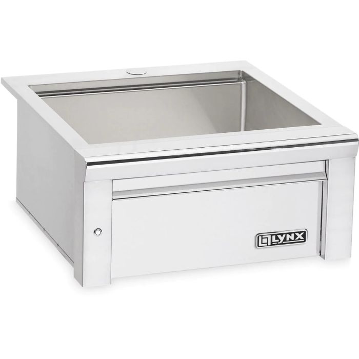 Extraordinary quality and design innovation can be yours with Lynx premium outdoor kitchen accessories. This Lynx sink is 24 inches wide and features a 3 1/2-inch center drain with stopper and basket. The sink can also accommodate a disposal unit. This stylish sink is also fully insulated and includes a top cover that allows you to use it for storing ice or chilling drinks.