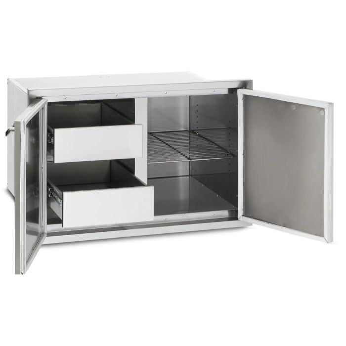 Extraordinary quality and design innovation can be yours with Lynx premium outdoor kitchen accessories. This Dry Storage Pantry with lock is fully sealed and the doors have a magnetic gasket which provides extra protection against moisture, rodents and insects. The left side of the pantry has two 17-inch wide slide out illuminated drawers for convenient storage while the right side has an adjustable wire shelf. Completely sealed, this pantry is constructed of heavy-duty stainless steel with a sleek, polished appearance with extraordinary quality. This cabinet is designed to match Lynx 36-inch Professional grills for a premium outdoor entertaining experience.Extraordinary quality and design innovation can be yours with Lynx premium outdoor kitchen accessories. This Dry Storage Pantry with lock is fully sealed and the doors have a magnetic gasket which provides extra protection against moisture, rodents and insects. The left side of the pantry has two 17-inch wide slide out illuminated drawers for convenient storage while the right side has an adjustable wire shelf. Completely sealed, this pantry is constructed of heavy-duty stainless steel with a sleek, polished appearance with extraordinary quality. This cabinet is designed to match Lynx 36-inch Professional grills for a premium outdoor entertaining experience.