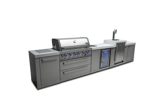 The Mont Alpi original series is tried and tested, strong and stunning. This grill combines six burners of standard cooking size along with an extremely useful infrared side burner suitable for searing, pan frying, and boiling and an infrared rear burner for the ultimate rotisserie experience. The grill comes standard with LED knob lights that are blue when off and red when on and bright internal cooking lights for perfect vision and precision control. The beverage center and kegerator module come standard with 3 3-bar kegerators, an outdoor refrigerator, and a sink + faucet.
