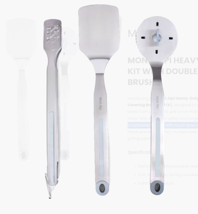 Introducing the Mont Alpi Heavy-Duty 3-Piece Tool Kit with Double Cleaning Brush (MATK), designed to take your grilling to the next level. Made from extra-safe, grill-proof materials and stainless steel construction, these tools offer both safety and longevity. The kit includes a grill brush with a replaceable head, soft-touch easy-spring lockable tongs, and a solid-head spatula, ensuring you have everything you need for a successful grilling experience.