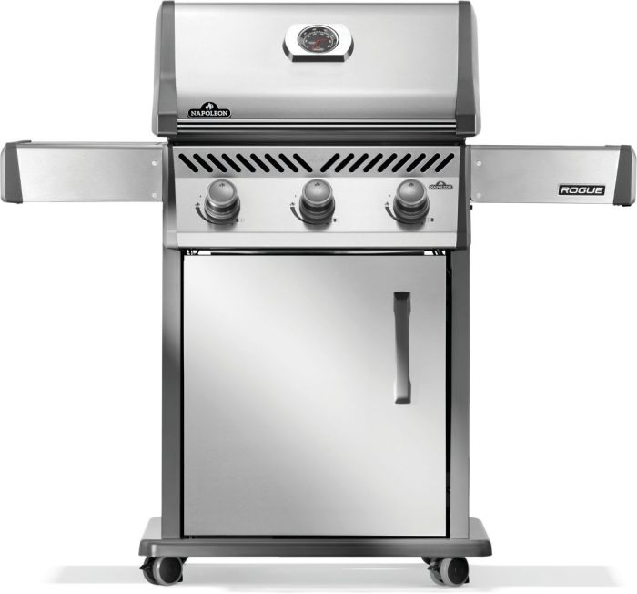 Napoleon’s Rogue® 425 Propane Gas Grill is a premium, yet affordable BBQ marvel. With three burners that light instantly and effortless temperature control, it ensures perfect grilling or roasting. Its cast iron cooking grids deliver even heating and exquisite sear marks, while stainless steel sear plates help reduce flareups. Durable and stylish stainless steel surfaces resist weather and wear. Foldable side shelves enhance storage versatility. Ignite instantly with battery-free ignition. Move effortlessly with Locking Caster Wheels. Enjoy exceptional grilling in any space.