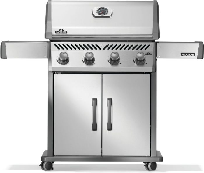 The sleek Napoleon Rogue® 525 Natural Gas Grill in stainless steel is a stylish upgrade for your outdoor living space. Achieve the best sear marks with our Wave cast iron grids. Four stainless steel burners ensure precise temperature control, while dual-level sear plates intensify flavors by vaporizing drippings. With 525 square inches of grilling space, create mouthwatering meals for any occasion. The easy-to-maintain porcelainized lid and powder-coated body seamlessly blend with your outdoor decor. Maneuver with ease using locking casters, and save space with folding stainless steel side shelves. Experience unmatched versatility, quality, and affordability with this Napoleon Rogue® Gas Grill.