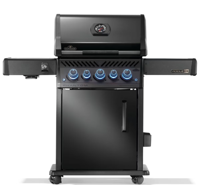 The Phantom Rogue PRO-S 425 Grill in Propane Gas, boasts a luxurious, matte black finish that exudes elegance. Crafted with premium features, this grill seamlessly combines sophistication and luxury. Its rear infrared rotisserie burner guarantees succulent roast meals, while the infrared sear station, side burner delivers restaurant-quality sides and sauces or sears meat to perfection. The iconic WAVE shaped cooking grids ensure even heating, while dual-level stainless steel sear plates vaporize drippings, keeping your barbecue pristine. With ergonomic control knobs for east and safe operation and a battery-free starter for instant ignition, this grill is designed for effortless performance. A convenient space-saving folding side shelf and easy-locking casters enhance versatility. Elevate your outdoor grilling experience with this premium BBQ, offering superior quality and style.