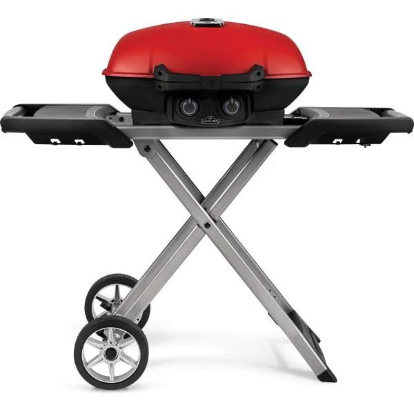 The beautiful red Napoleon TravelQ™ 285X Portable Propane Gas Grill with Scissor Cart is a grill that is leading the way with innovation and quality. Napoleon's TravelQ™ 285X has everything you need for perfect portable grilling anywhere. Featuring all-terrain wheels, easy folding, setup, and compact storage. Two burners provide precise heat for indirect grilling and smoking, or high heat searing and is ideal for cooking small chickens or roasts thanks to a high-top cast aluminum lid. You'll know it's a Napoleon with the iconic WAVE™ cooking grids for those distinctive sear marks. The porcelain coated cast iron cooking grids and griddle season up just like a cast iron frying pan. Go anywhere by hooking up a 1.2 lb. propane cylinder, or stay put with a full-sized tank. The TravelQ™ 285X has everything you need for successful grilling on the go. Winner of two prestigious awards, the 2014 Vesta in the gas barbecue division, and the award for Top Ten Best Value Grill from AmazingRibs.com.