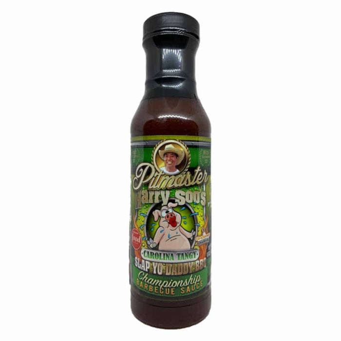 For fans of tangy sauces, this vinegar-based sauce will pucker up your lips and is awesome itself or when mixed with Harry’s Cheeky Sweet Sauce. I love North Carolina vinegar sauce especially on pork but some are too tart for me. This is my rendition of a more nuanced vinegar sauce that’s been given some Slap Yo Daddy love. In competition, I blended it 75% to 25% of my Cheeky Sweet to win 1st place KCBS Chicken Team of the Year. Baste on the last few minutes to form a glaze or pour on just before serving. It also makes a great dipping sauce!| Offer | Store Pickup Available |