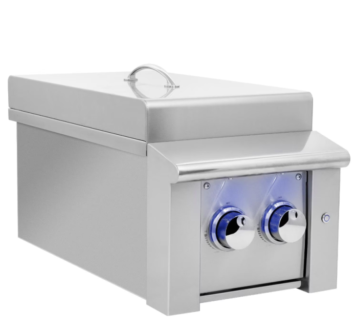 The Summerset Alturi series combines luxury with raw power, creating a new level of professional outdoor kitchen accessories. This liquid propane double side burner features two heavy-duty 17,500 BTU solid brass burners for exceptional performance and heat retention. The side burner is constructed from precision cut 304 grade stainless steel for maximum longevity in your outdoor kitchen. The 9mm stainless steel cooking grates provide a sturdy cooking surface for pots and pans of nearly any size. It includes a stainless steel lid to protect the burner when not in use. Simple push and turn ignition gets the fire going quickly and a full-width drip tray makes cleanup simple. The ALTSB-2 also includes LED front panel lighting which matches the styling of Summerset Alturi grills for a coordinated look.